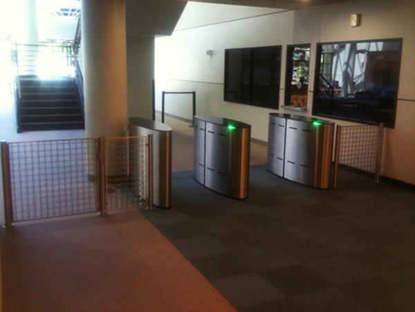 Custom designed stainless architectural fencing at Southwest Airlines Headquarters provides security access points.